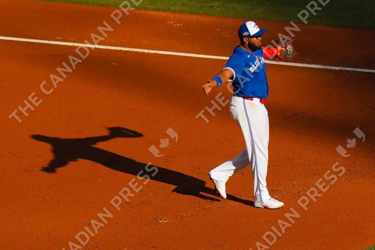 Toronto Blue Jays' Vladimir Guerrero Jr. (27) stands at first base during MLB American League Division Series baseball action against New York Yankees in Toronto, Sunday, Oct. 5, 2025. THE CANADIAN PRESS/Chris Young