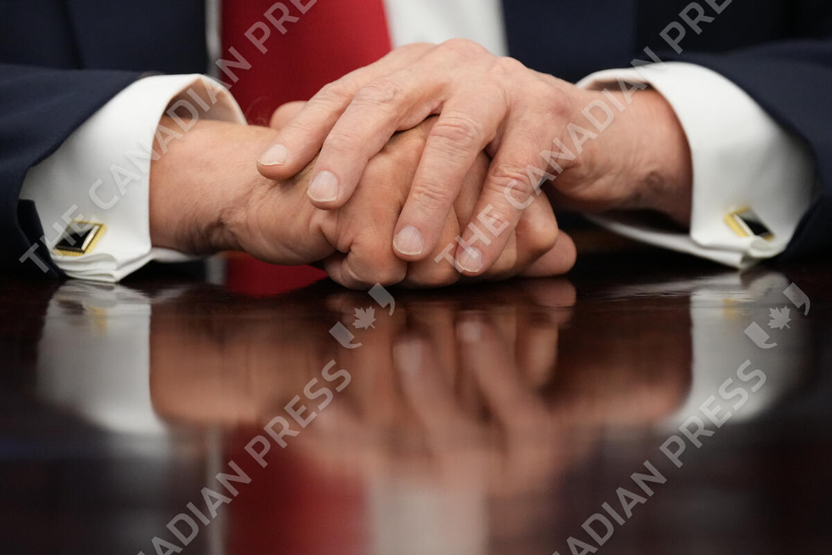 President Donald Trump rests his hands on the Resolute Desk as he speaks to reporters before signing an executive order in the Oval Office at the White House, Monday, Oct. 6, 2025, in Washington. (AP Photo/Jacquelyn Martin)