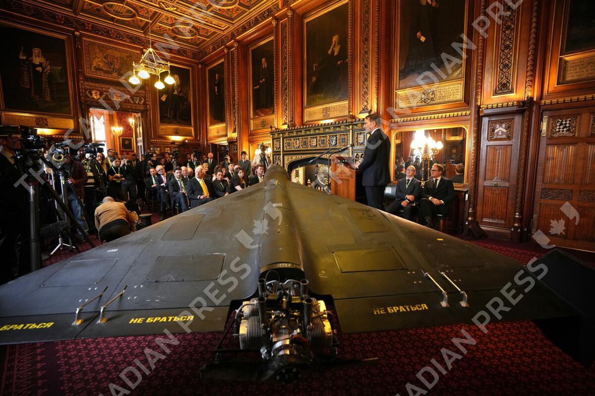 Foreign Minister of Poland, Radek Sikorski speaks next to an Iranian Shahed-136 attack drone, acquired from Ukraine by United Against Nuclear Iran (UANI), at a press conference in Parliament in London, Tuesday, Oct. 14, 2025. This is the same weapon Russia has used to devastating effect against Ukraine, with over 38,000 drones launched in 2025 alone. (AP Photo/Kin Cheung)