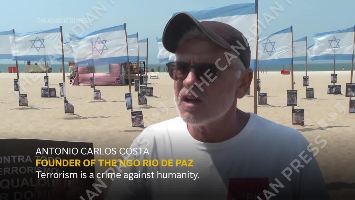 Activists from the NGO Rio de Paz held a demonstration on Copacabana Beach on Tuesday, calling for the release of all hostages held by Hamas in Gaza during the second anniversary of the Gaza war. (AP video by Mario Loabo.)