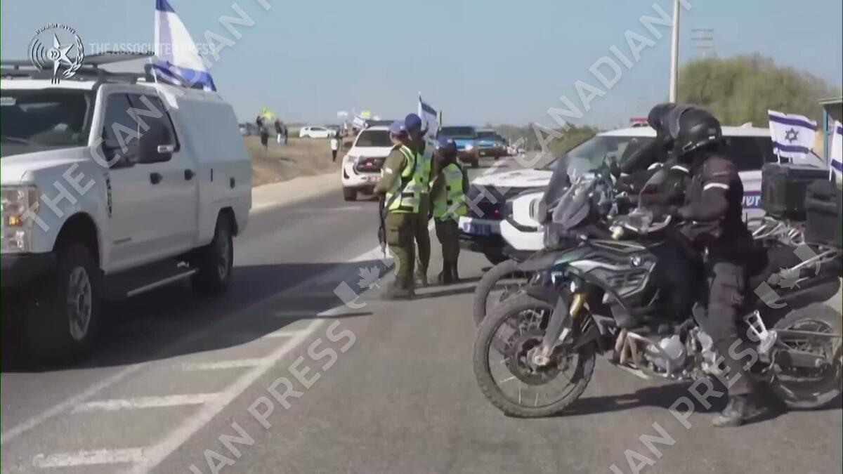 Israel police on Monday shared footage of a convoy transporting the bodies of deceased hostages returned in a deal with Hamas following a ceasefire.