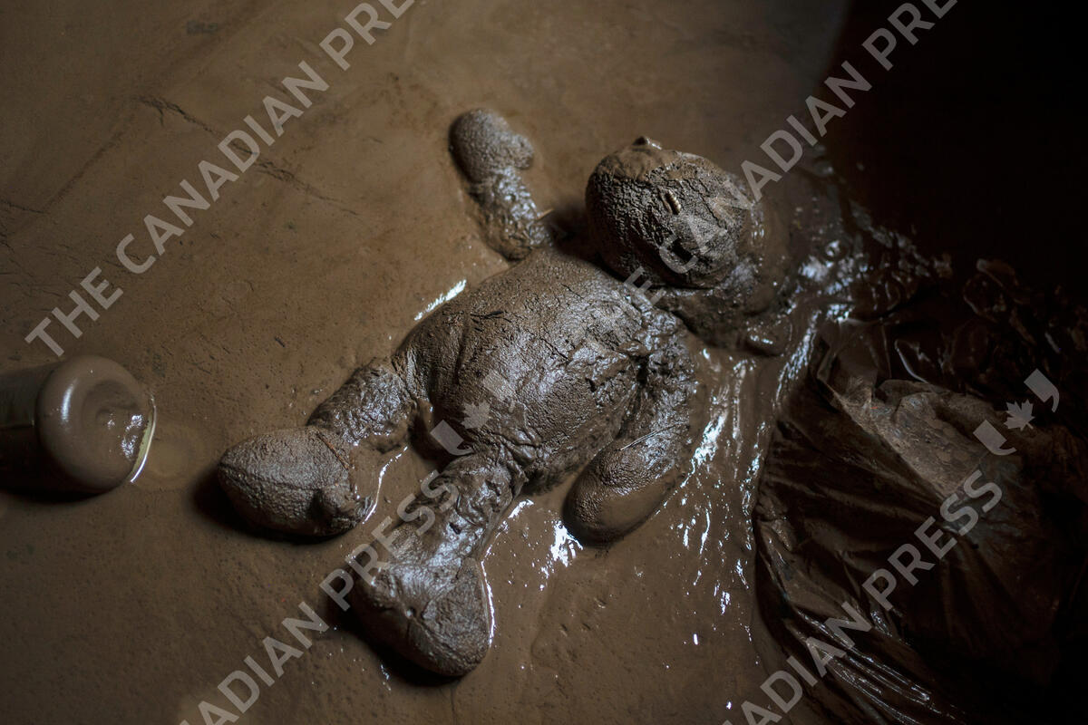 A plush toy lies in the mud inside a flooded house in Poza Rica, Veracruz state, Mexico, Monday, Oct. 13, 2025, after torrential rains. (AP Photo/Felix Marquez)