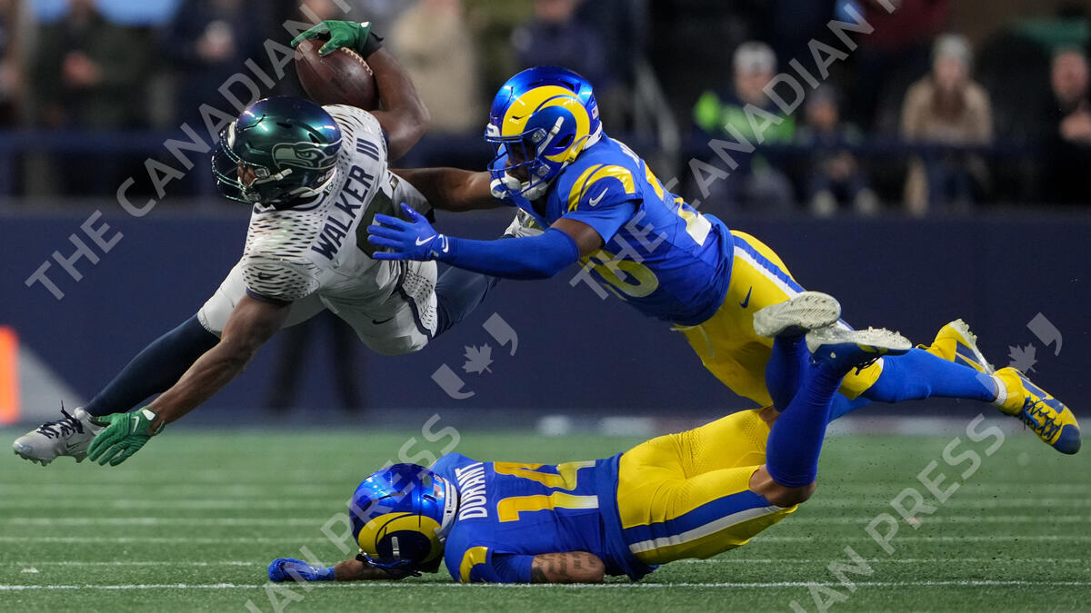 Seattle Seahawks running back Kenneth Walker III (9) tries to get past Los Angeles Rams safety Kamren Kinchens, right, cornerback Cobie Durant (14) during the first half of an NFL football game Thursday, Dec. 18, 2025, in Seattle. (AP Photo/Lindsey Wasson)