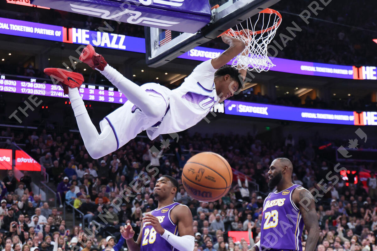 Utah Jazz guard Ace Bailey, top, hangs on the rim after a dunk against the Los Angeles Lakers during the second half of an NBA basketball game Thursday, Dec. 18, 2025, in Salt Lake City. (AP Photo/Rob Gray)