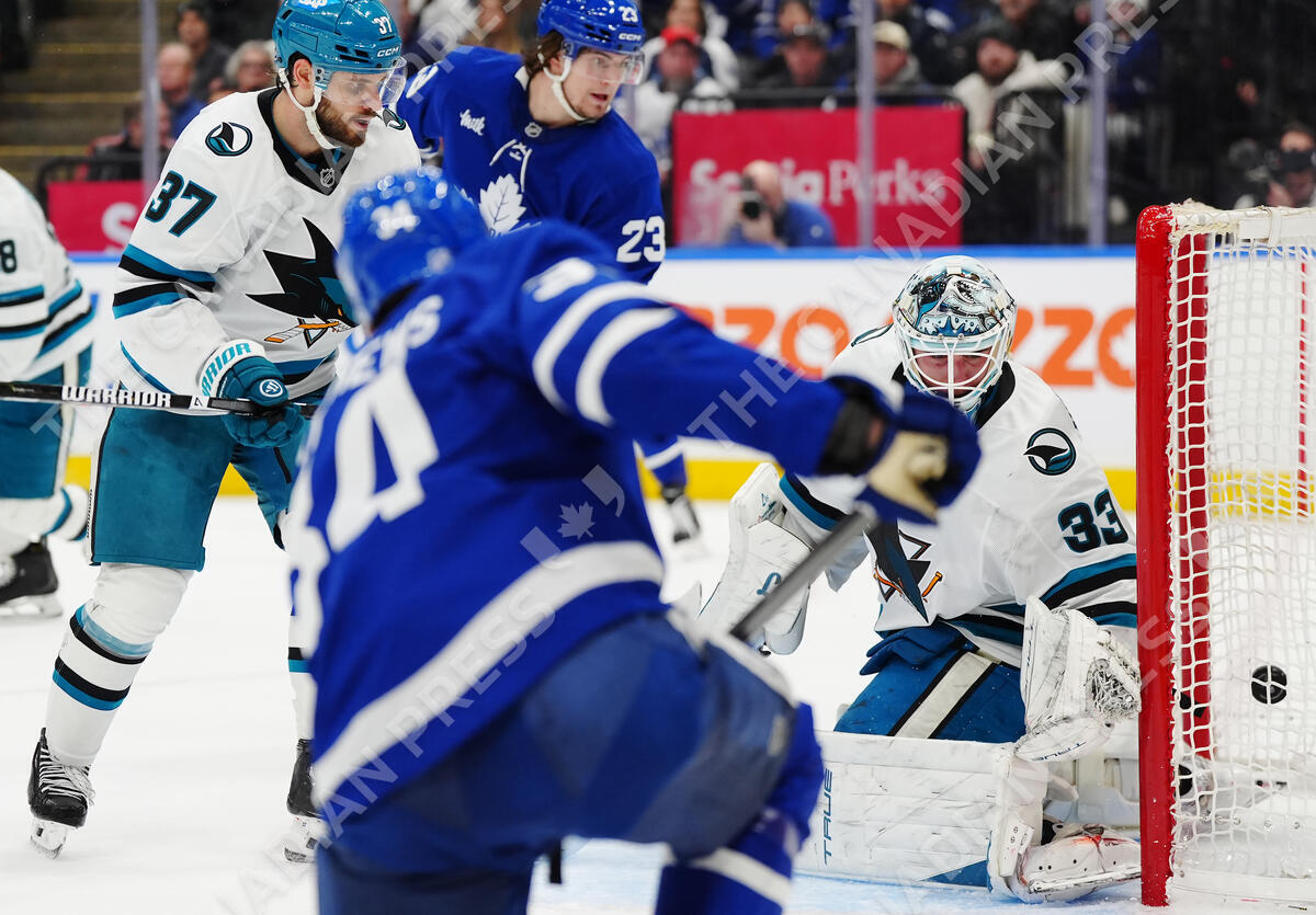 Toronto Maple Leafs' Auston Matthews (front) scores on San Jose Sharks goaltender Alex Nedeljkovic (33) as Sharks' Timothy Liljegren (37) and Maple Leafs' Matthew Knies (23) look on during second period NHL hockey action in Toronto on Thursday, Dec. 11, 2025. THE CANADIAN PRESS/Frank Gunn