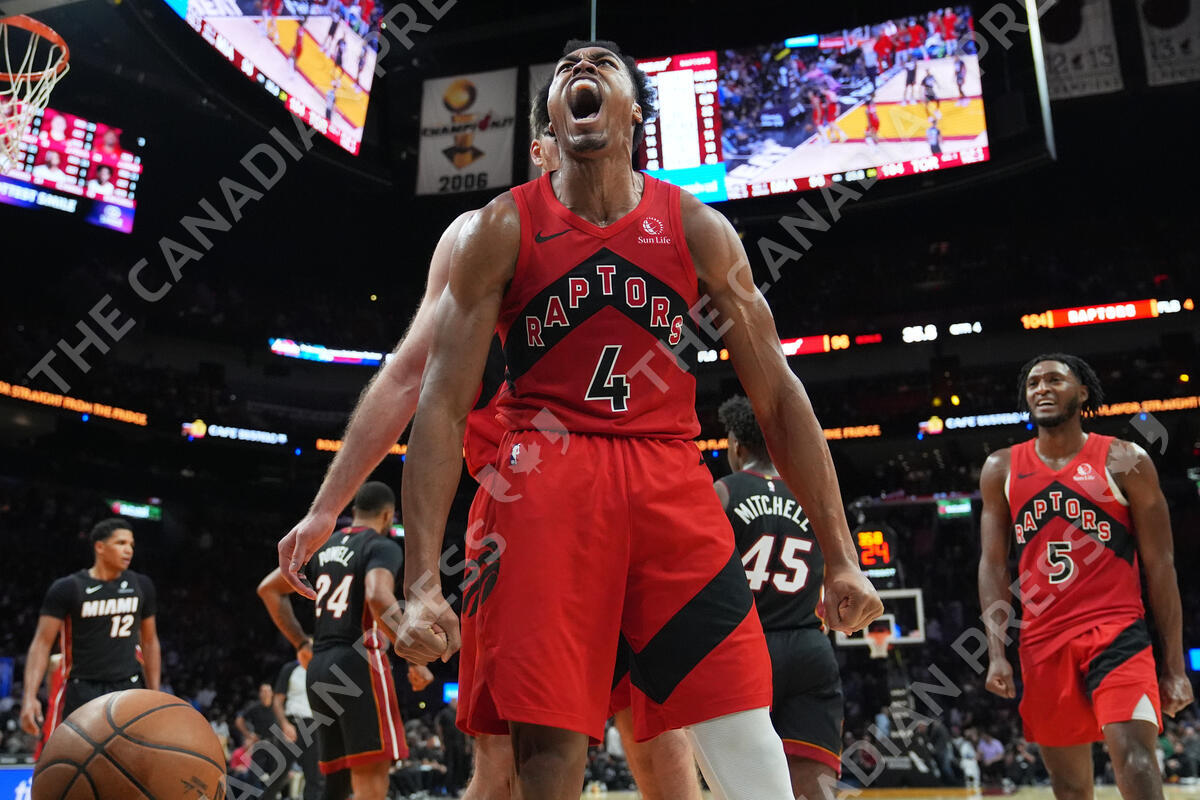 Toronto Raptors forward Scottie Barnes (4) reacts after being fouled during the second half of an NBA basketball game against the Miami Heat, Monday, Dec. 15, 2025, in Miami. (AP Photo/Lynne Sladky)