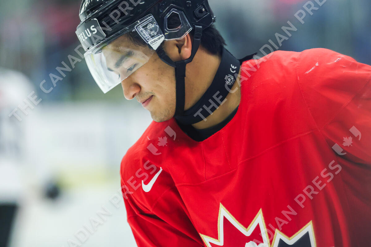 Zayne Parekh, of Nobleton, Ont., participates in Canada's National Junior Team training camp in Niagara Falls, Ont., Tuesday, Dec. 16, 2025. THE CANADIAN PRESS/Nick Iwanyshyn