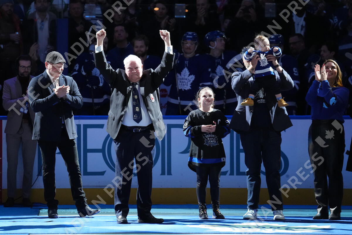 Toronto broadcaster Joe Bowen acknowledges the crowd as he's honoured during pregame ceremonies prior to during first period NHL hockey action between the Toronto Maple Leafs and the Chicago Blackhawks, in Toronto, Tuesday, Dec. 16, 2025. Bowen will retire after 44 years in the booth. THE CANADIAN PRESS/Nathan Denette