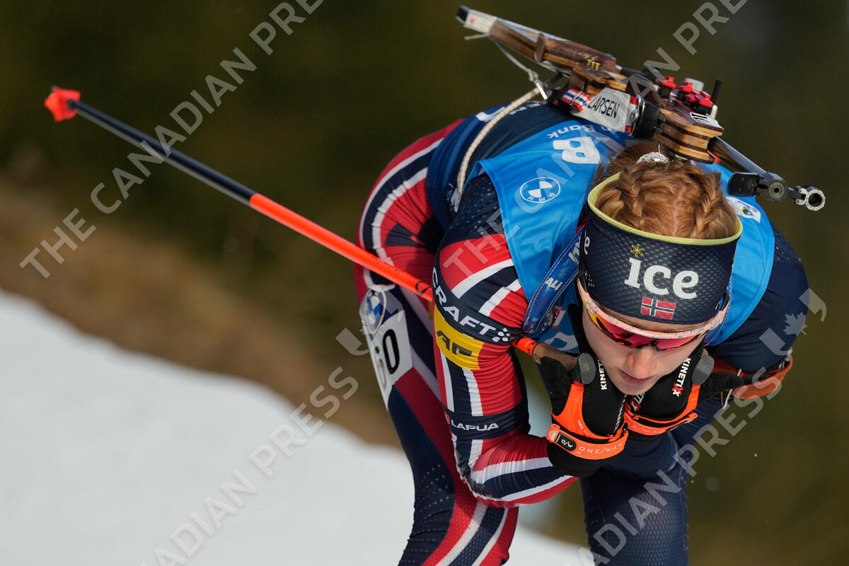 Maren Kirkeeide of Norway competes in the women's 7.5 km sprint competition at the Biathlon World Cup in Hochfilzen, Austria, Friday, Dec. 12, 2025. (AP Photo/Matthias Schrader)