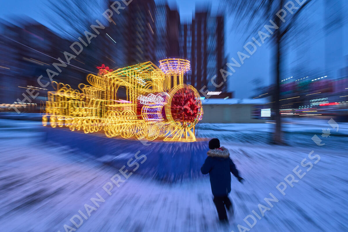 A boy runs up to a model of festive train installed prior to Christmas and New Year festivities in St. Petersburg, Russia, Monday, Dec. 15, 2025. (AP Photo/Dmitri Lovetsky)