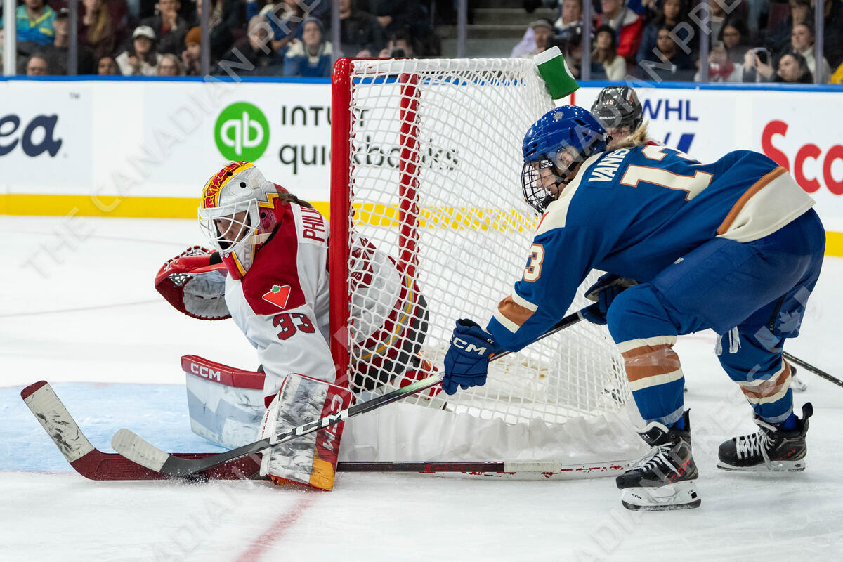 Ottawa Charge goaltender Gwyneth Philips (33) stops Vancouver Goldeneyes' Tereza Vanisova (13) during the third period of a PWHL hockey game in Vancouver, B.C., Tuesday, Dec. 16, 2025. THE CANADIAN PRESS/Ethan Cairns