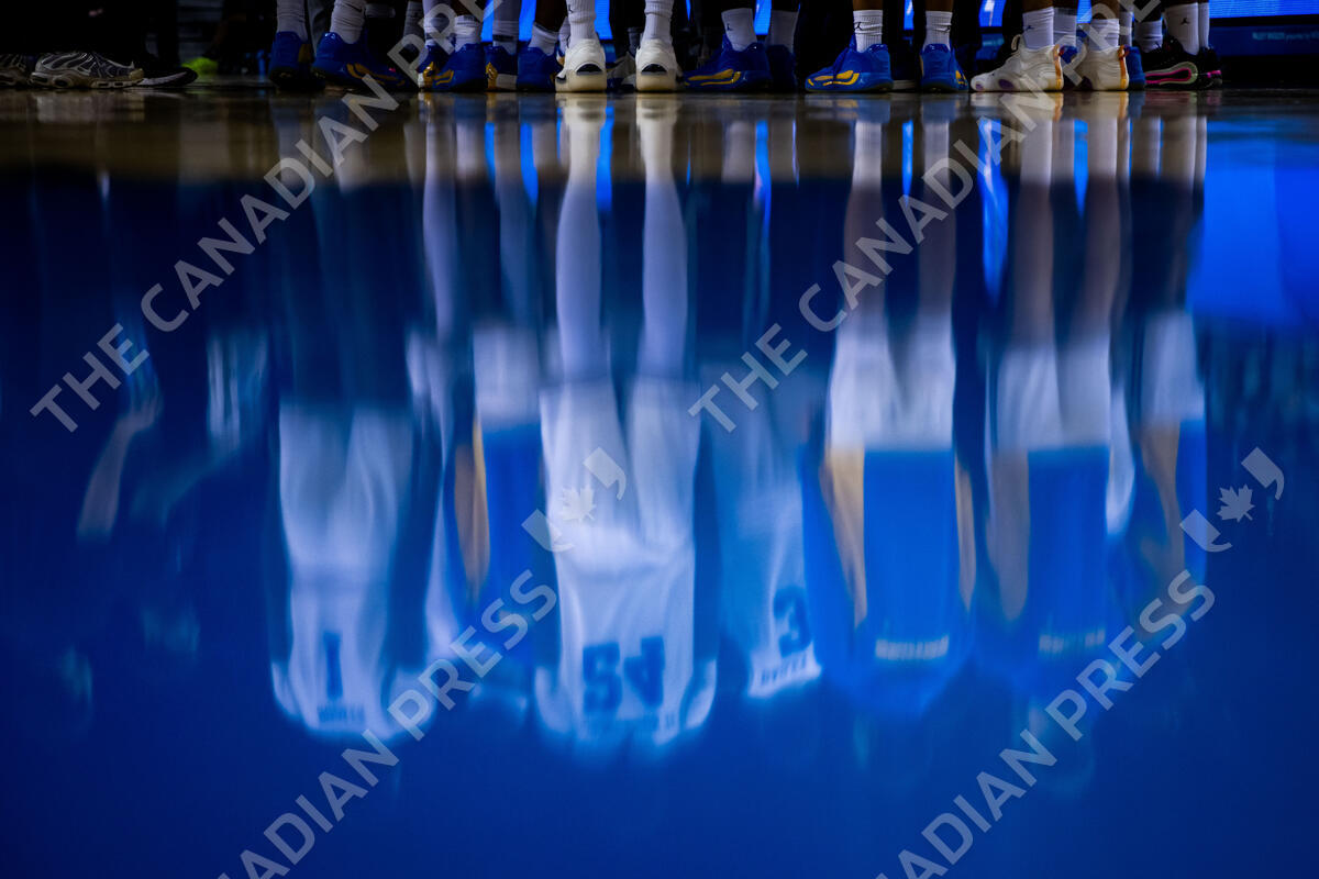 UCLA huddles during a timeout during the second half of an NCAA college basketball game against Arizona State, Wednesday, Dec. 17, 2025, in Los Angeles. (AP Photo/Ethan Swope)
