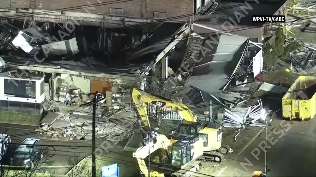 Construction crews worked to clear the rubble of a Pennsylvania nursing home Wednesday, a day after a powerful explosion killed two people, hospitalized 20 others, sent flames shooting out and collapsed part of the building. (AP Production: Marissa Duhaney)