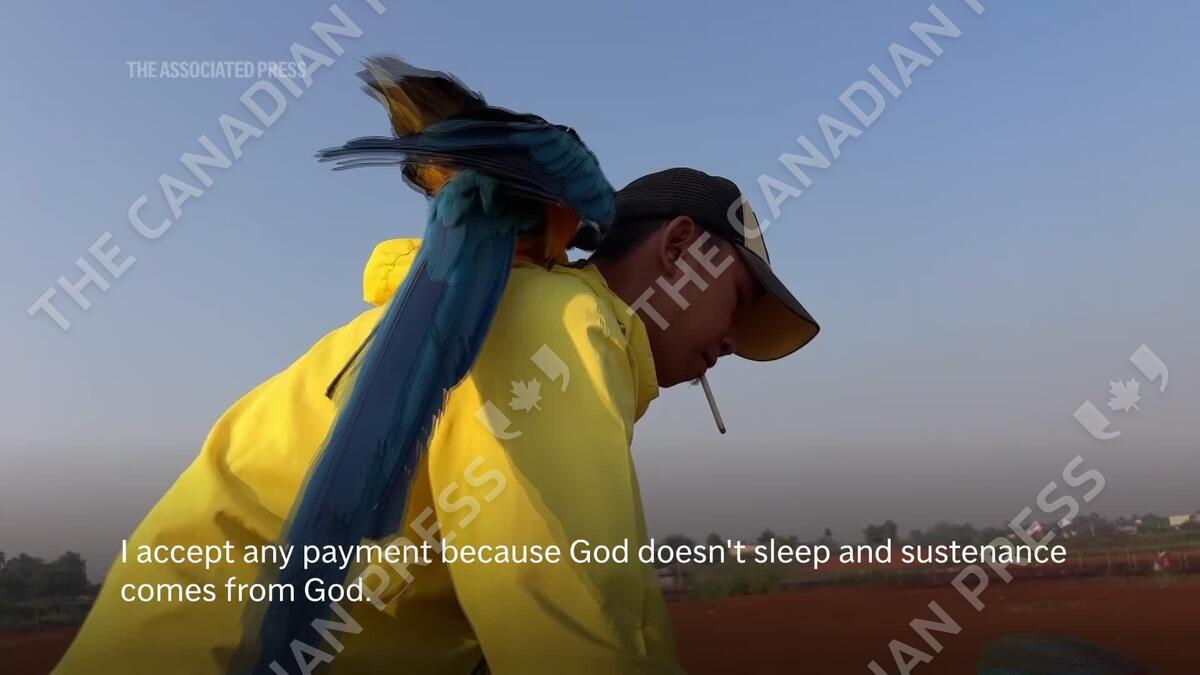 Albi Albar Ramli’s passion for birds began in 2018 when he kept small parakeets, but soon he dreamed of caring for larger, more elegant species like macaws. Inspired by videos on social media showing birds returning faithfully to their trainers after flying freely, the 33-year-old decided to leave his job as a motorcycle mechanic to focus on this new path as a macaw trainer. (AP Video by Fadlan Syam)