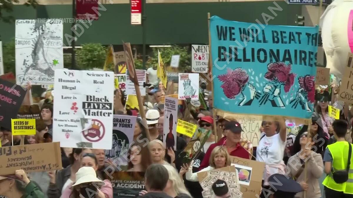 On the eve of New York Climate Week, activists and members of the public gathered in the city to protest the financial institutions that they claim are "profiting" off the climate crisis and wars. (AP Video: Aron Ranen)