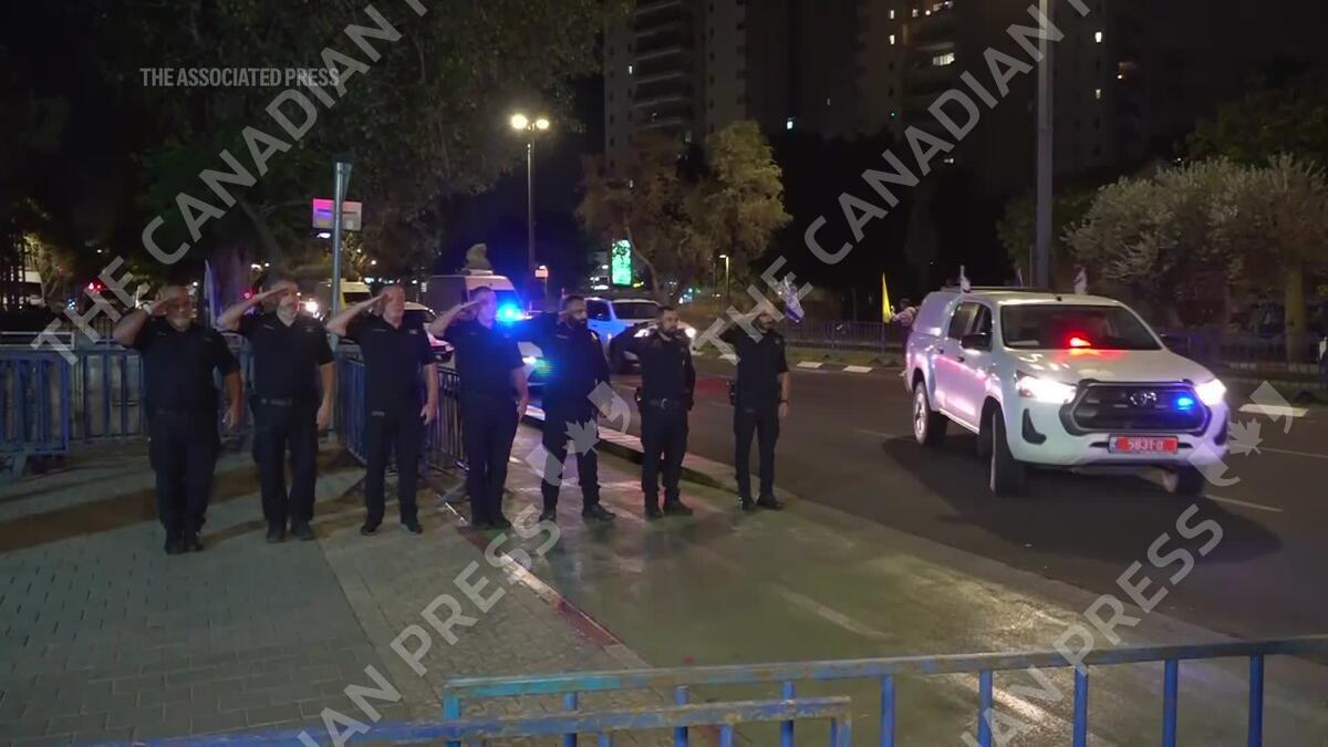 The remains of four more hostages handed over by Hamas arrived Tuesday evening at a forensic institute in Tel Aviv. Police officers saluted and supporters watched on as the vehicles rolled through. (AP Video by Nic Dumitrache)