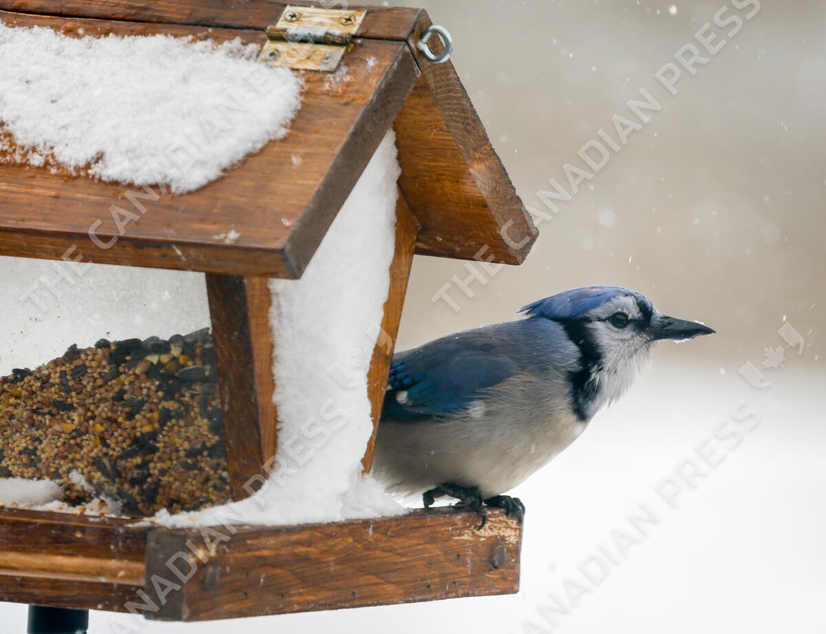 A Blue Jay eats from a bird feeder as snow falls near Cremona, Alta., Sunday, Oct. 12, 2025. Alberta got it's first snowfall of the season and is experiencing the coldest Thanksgiving in decades. THE CANADIAN PRESS/Jeff McIntosh