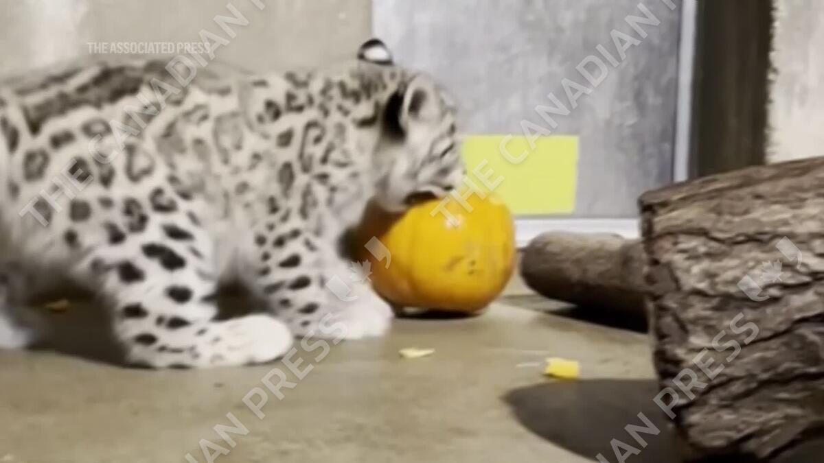 A nearly three-month old snow leopard cub named Juniper got her first pumpkin experience recently at the John Ball Zoo in Grand Rapids, Michigan. Officials there say snow leopards generally don’t eat pumpkins, but they don't mind playing with them.