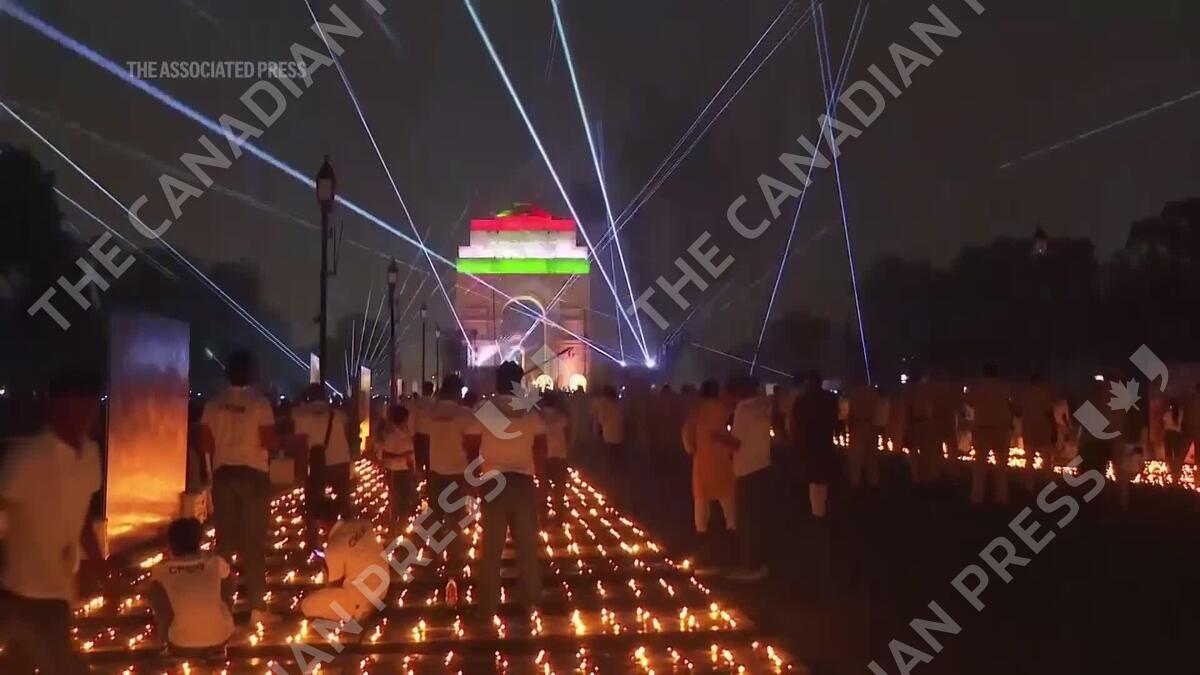 Volunteers lit oil lamps illuminating the path leading up to the India gate memorial in New Delhi on Saturday ahead of the festival of lights, Diwali. (AP video by Shonal Ganguly, Piyush Nagpal, Channi Anand, and Rajanish Kakade)