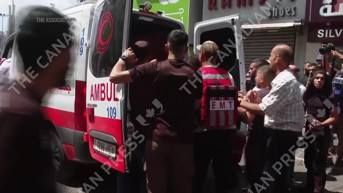 The Palestinian Red Crescent said there were 19 injuries during the raid, including injuries from live and rubber bullets, tear gas inhalation, and shrapnel. Israeli armored vehicles entered a busy downtown intersection in the city, stopping traffic. A few dozen people attempted to throw rocks at the military vehicles. (AP video shot by Imad Isseid)