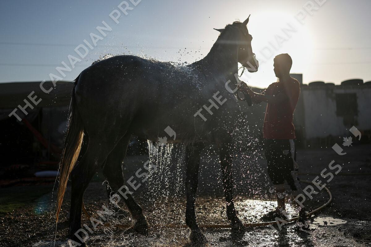 A local resident cleans his horse in Palmyra, Syria, Tuesday Aug. 26, 2025. (AP Photo/Ghaith Alsayed)