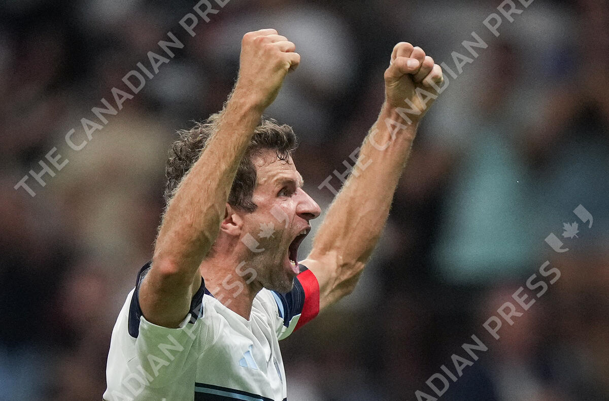 Vancouver Whitecaps Thomas Muller celebrates his winning penalty kick goal against St. Louis City during the second half of an MLS soccer match, in Vancouver, on Saturday, August 23, 2025. THE CANADIAN PRESS/Darryl Dyck