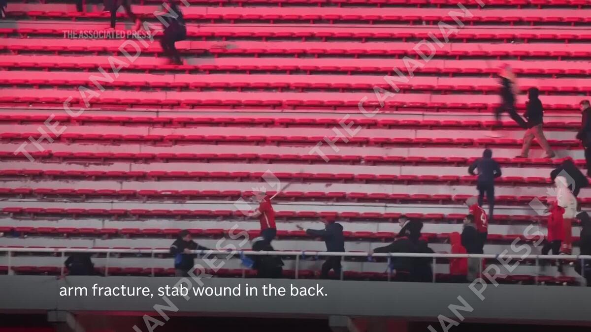 More than 100 fans were arrested after violence erupted in the stands during a Copa Sudamericana match between Independiente and Universidad de Chile and left at least 20 people injured, one of them in critical condition, local authorities said Thursday. (AP Video shot by Gustavo Ortiz and Cristian Kovadloff)