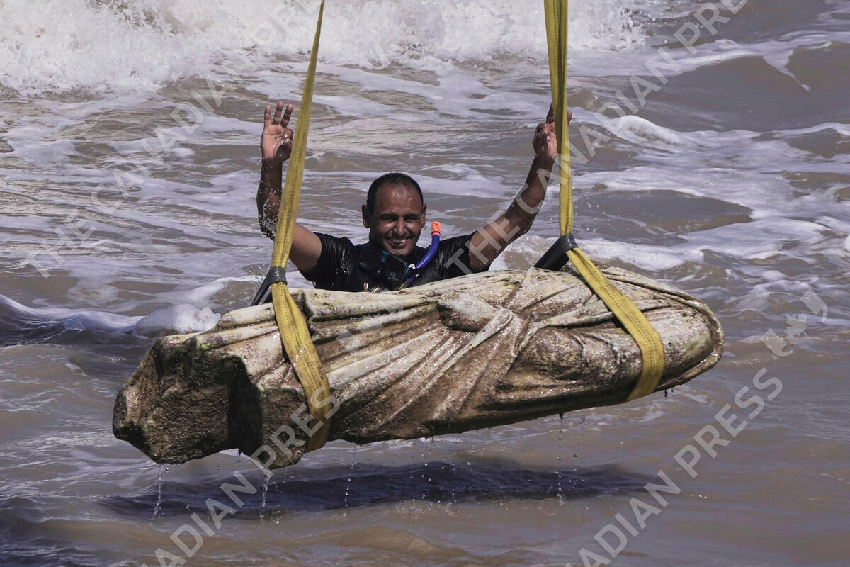 A diver celebrates after one of the ancient relics was lifted out of the water in the Abu Qir Bay in the Mediterranean Sea city of Alexandria, Egypt, Thursday, Aug. 21, 2025. (AP Photo/Amr Nabil)