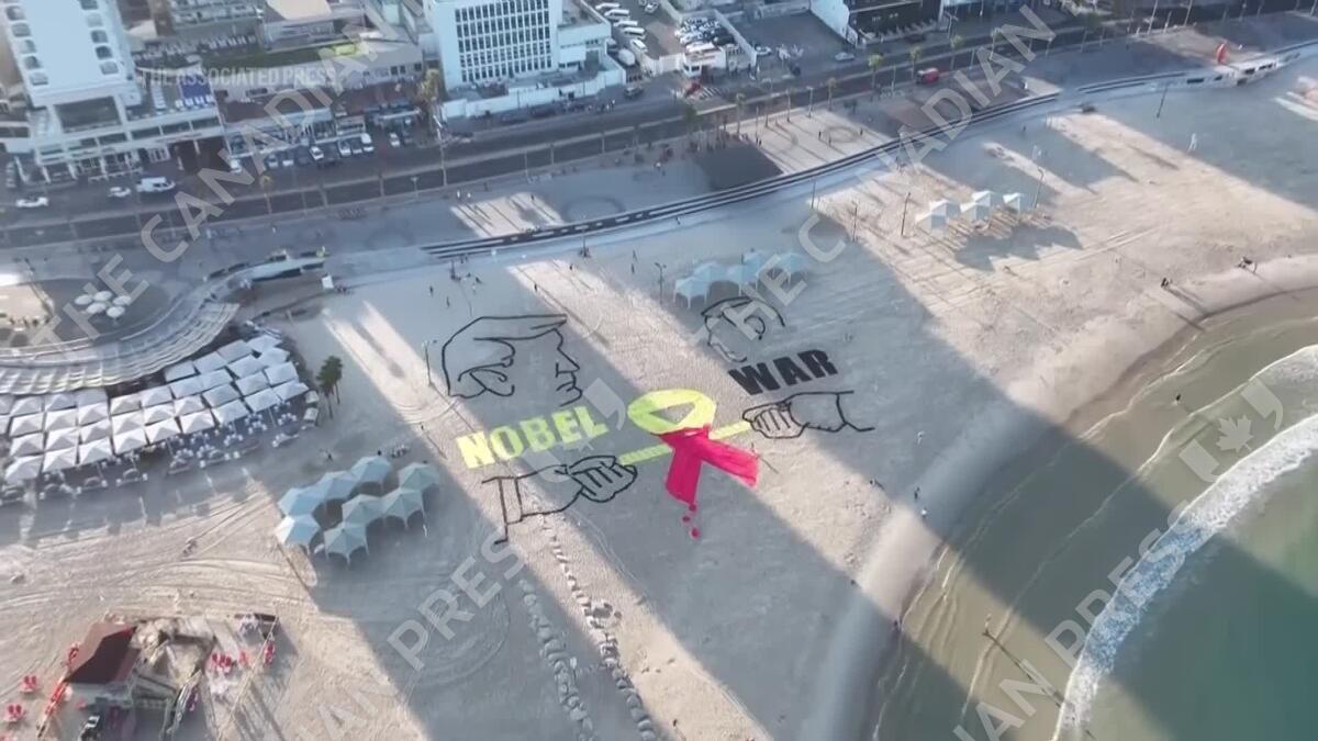 Giant drawing of Trump and Netanyahu on Tel Aviv beach draws attention to plight of hostages