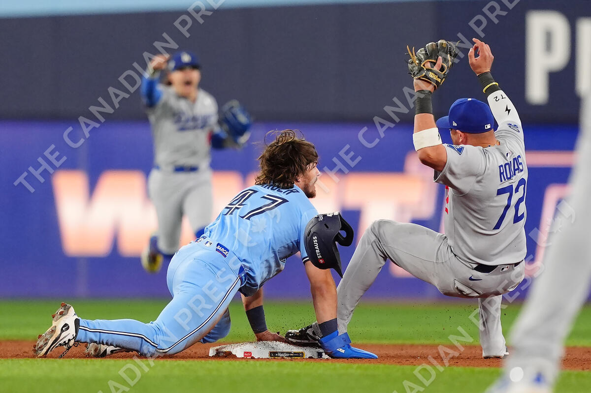 Los Angeles Dodgers second baseman Miguel Rojas (72) fields a throw to force out Toronto Blue Jays' Addison Barger (47) at second to turn a double play to end the game during ninth inning Game 6 World Series playoff MLB baseball action in Toronto on Friday, Oct. 31, 2025. THE CANADIAN PRESS/Frank Gunn