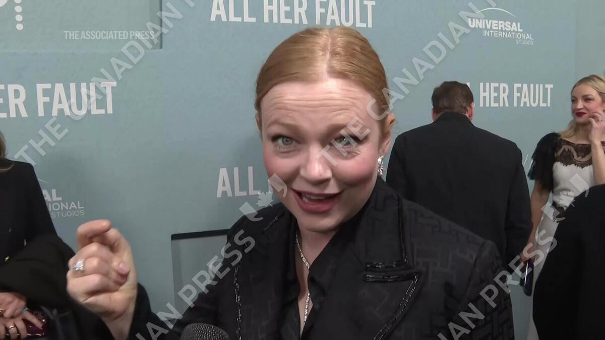 At the New York premiere of the new Peacock drama series "All Her Fault," Sarah Snook says Jake Lacy "kept it light" on set during filming. (Nov. 3)