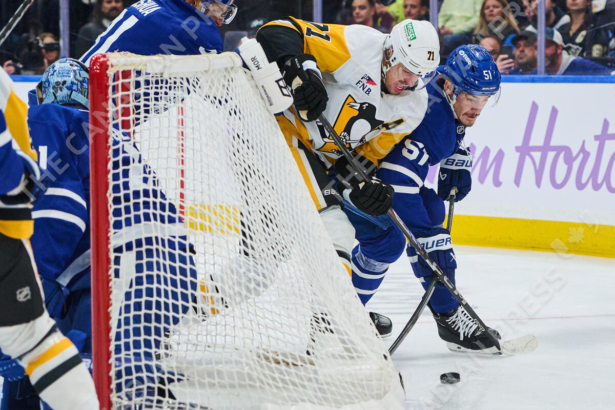 Toronto Maple Leafs' Philippe Myers (51) and Pittsburgh Penguins' Evgeni Malkin (71) battle for the puck during first period NHL hockey action in Toronto, on Monday, Nov. 3, 2025. THE CANADIAN PRESS/Sammy Kogan