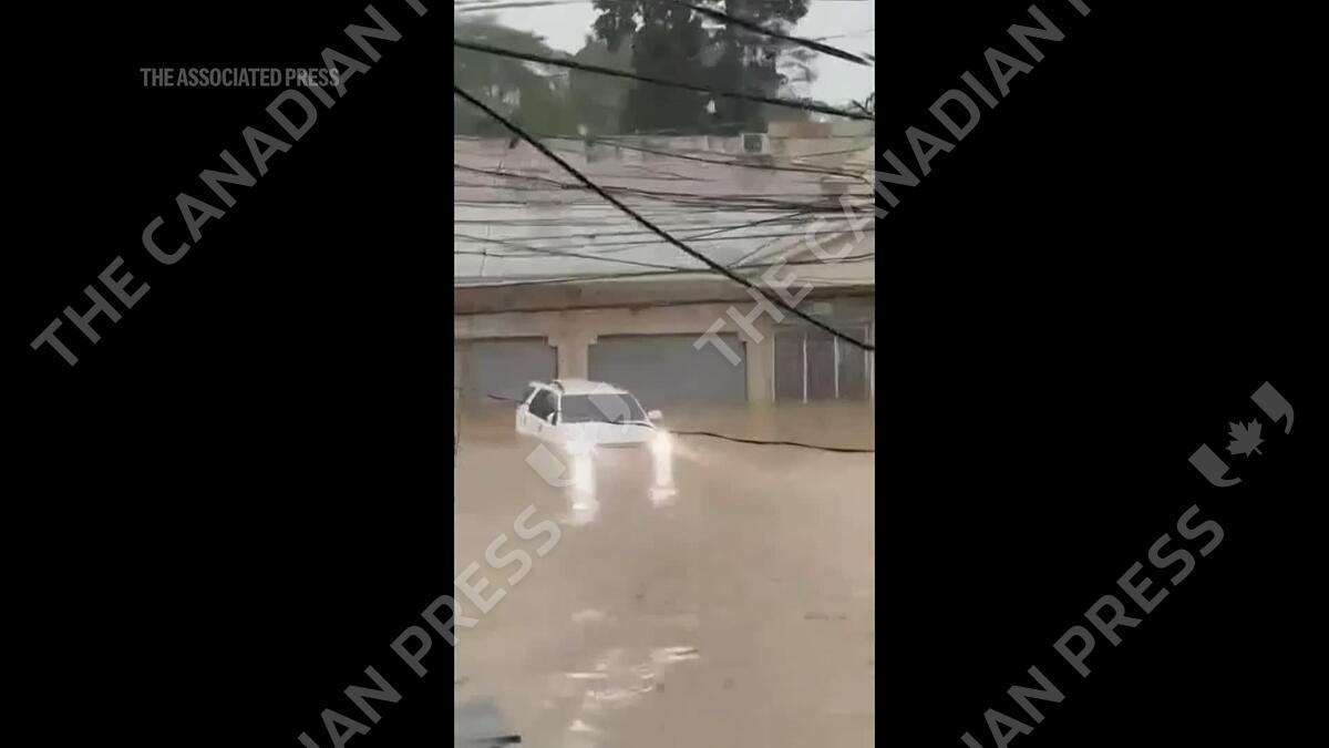 Vehicles float down street as deadly Typhoon Kalmaegi causes flash floods in the Philippines