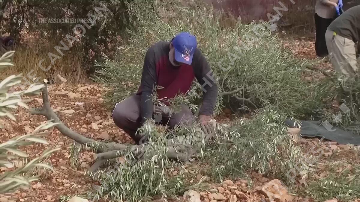 Foreign volunteers joined Palestinian farmers on Tuesday to help harvest olive trees in the West Bank, amid mounting reports of settler violence during this year’s olive-picking season. (AP video by Imad Isseid )