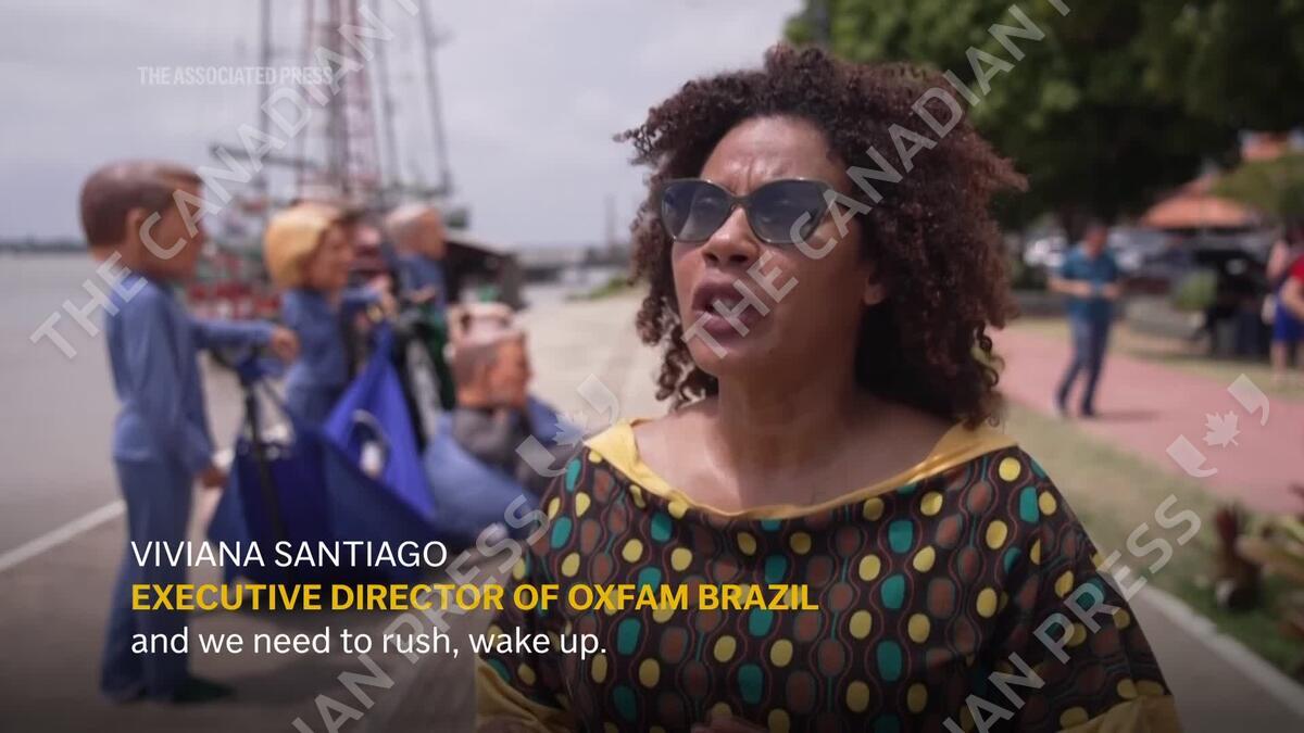 Activists from several organisations held protests on Wednesday in the Brazilian city of Belem where COP30 is taking place, calling for greater action to combat climate change. (AP/Lucas Dumphreys and Alan K. Guimaraes)
