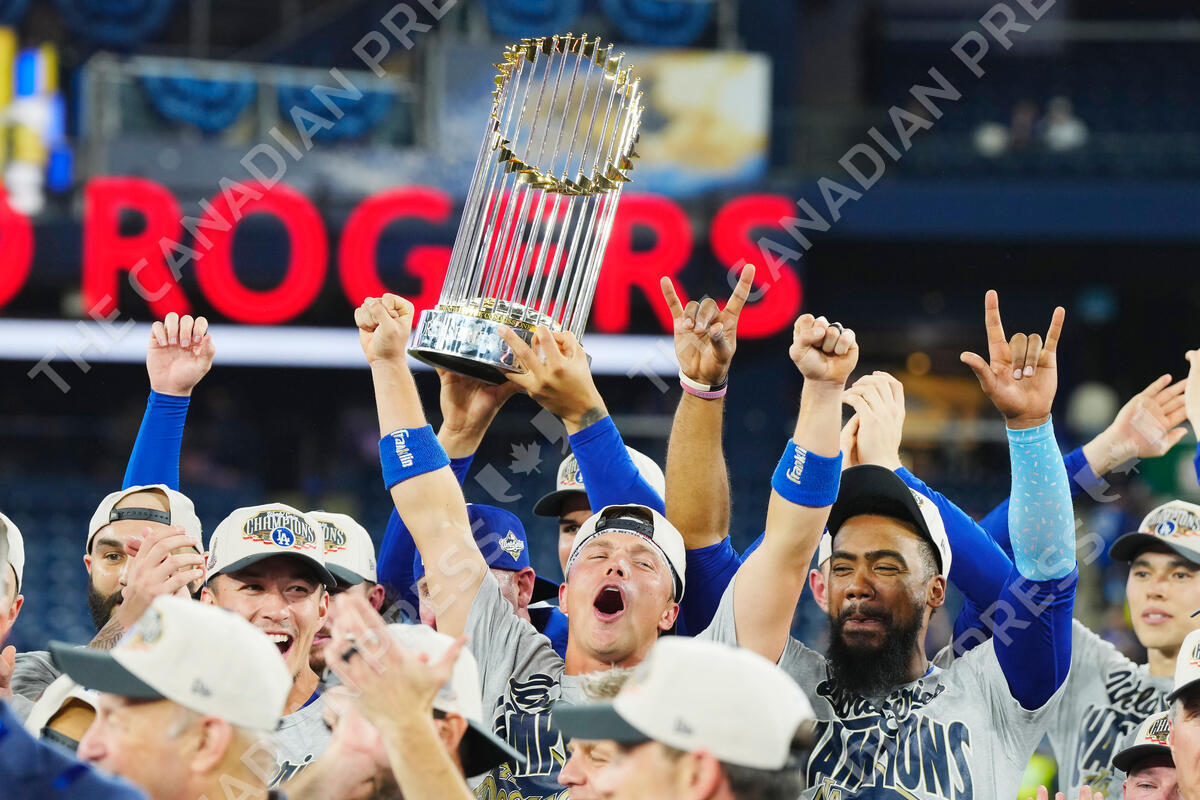 The Los Angeles Dodgers hoist the Commissioner's Trophy after the Dodgers defeated the Toronto Blue Jays in Game 7 World Series playoff MLB baseball action in Toronto early Sunday, Nov. 2, 2025. THE CANADIAN PRESS/Frank Gunn