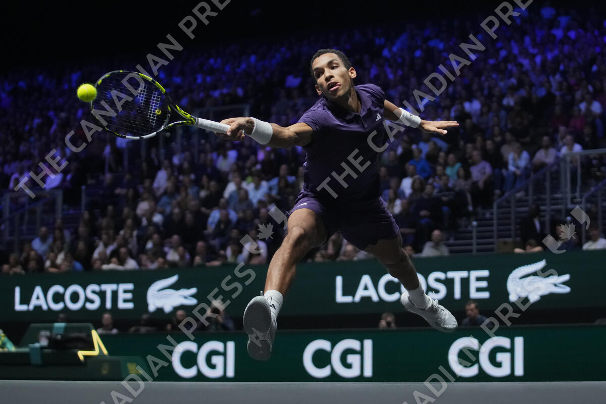 Canada's Felix Auger-Aliassime returns to Kazakhstan's Alexander Bublik during a semifinal match of the Paris Masters tennis tournament in Paris, Saturday, Nov. 1, 2025. (AP Photo/Christophe Ena)