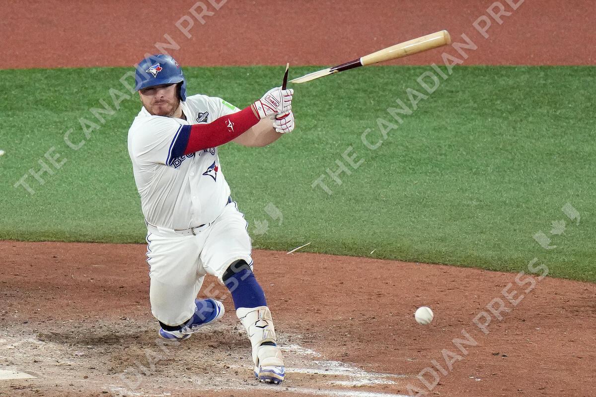 Toronto Blue Jays catcher Alejandro Kirk (30) breaks his bat as he grounds out into a double play during eleventh inning Game 7 World Series playoff MLB baseball action against the Los Angeles Dodgers, in Toronto, Sunday, Nov. 2, 2025. THE CANADIAN PRESS/Chris Young