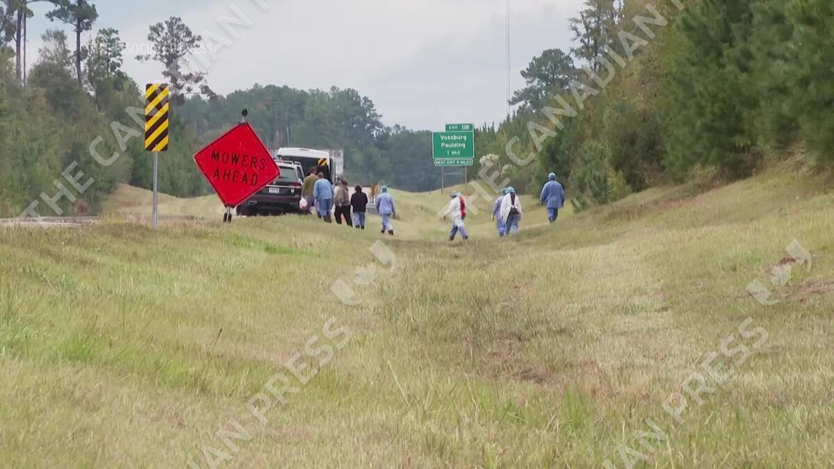 People searched the side of a Mississippi highway Wednesday afternoon after a truck carrying 21 research monkeys overturned there a day before and several monkeys escaped. (AP Video / Sophie Bates)