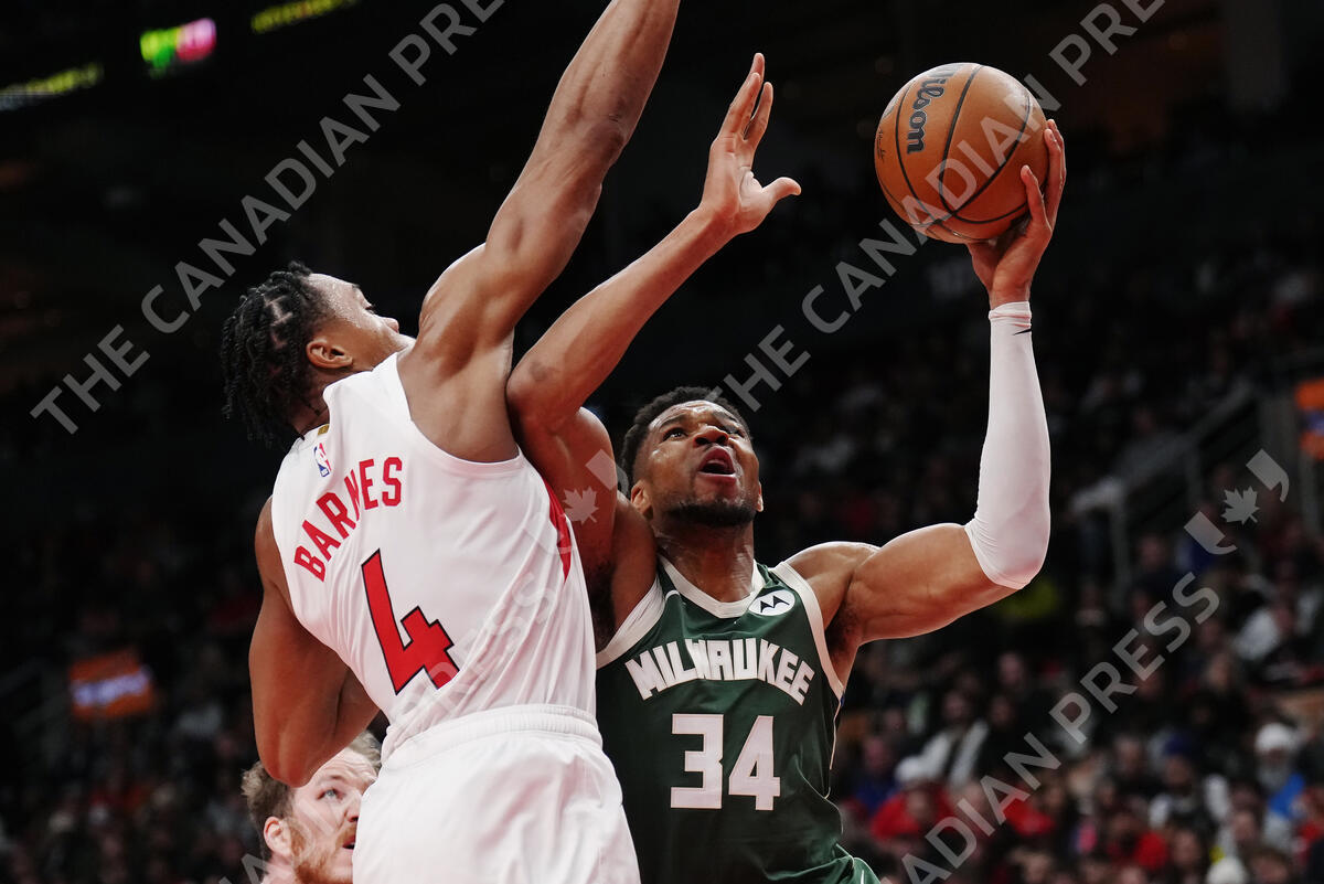Milwaukee Bucks' Giannis Antetokounmpo (34) drives at Toronto Raptors' Scottie Barnes (4) during second half NBA basketball action in Toronto on Tuesday, November 4, 2025. THE CANADIAN PRESS/Nathan Denette