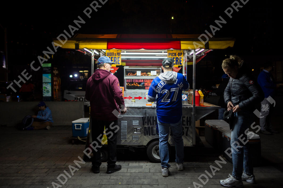 Baseball fans visit a food truck ahead of World Series Game 7 between the Toronto Blue Jays and Los Angeles Dodgers in Toronto on Saturday, November 1, 2025. THE CANADIAN PRESS/Nick Iwanyshyn