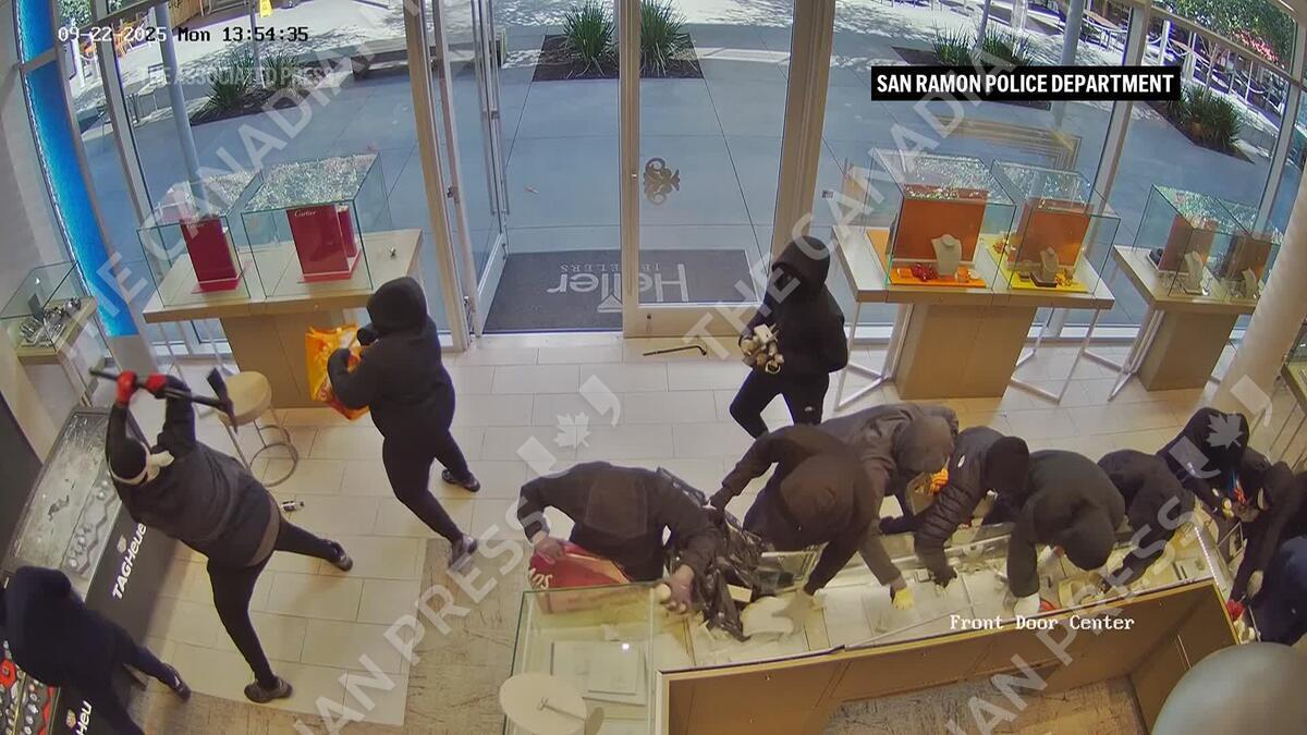 Two dozen people wearing masks and some carrying pickaxes smash jewelry cases and rob store