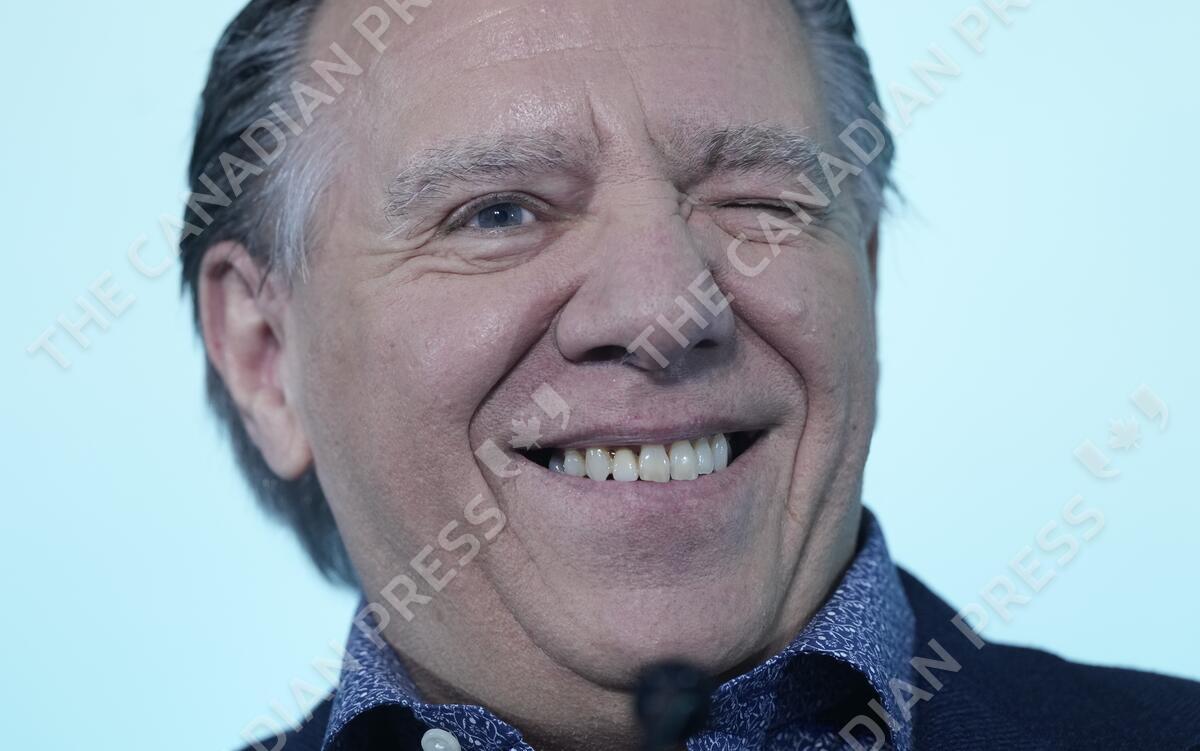 Quebec Premier Francois Legault winks at a member of the audience before speaking at the CAQ convention in Gatineau on Sunday, Sept. 28, 2025. THE CANADIAN PRESS/Adrian Wyld