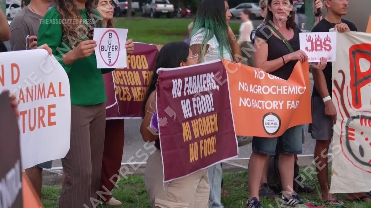 Demonstrators gathered on a roundabout at the COP30 venue in Belem, Brazil, calling the UNFCCC to keep the lobbyists from big agribusiness out of the UNFCCC. (AP Video by Joshua A. Bickel)