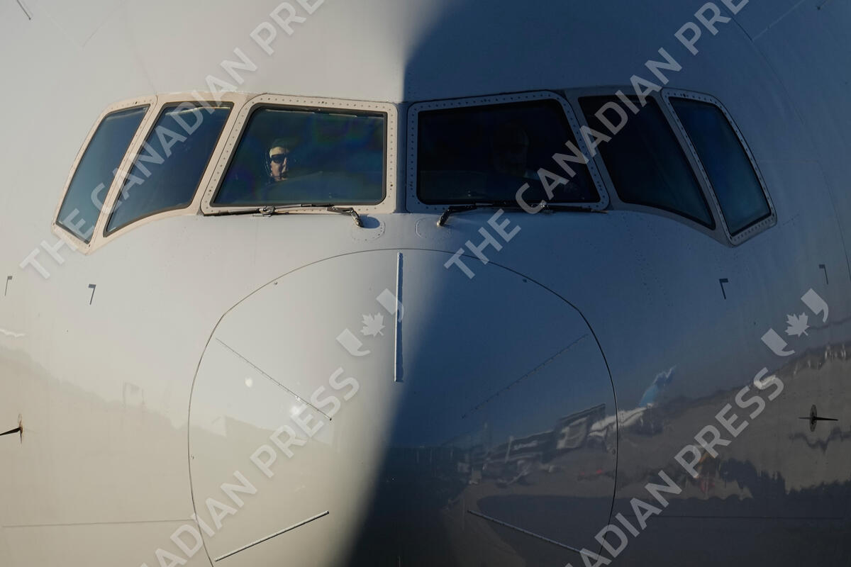 A pilot looks out of a cockpit window as the airplane of the Colts football team arrives from Indianapolis at the airport ahead of the upcoming NFL game between the Indianapolis Colts and the Atlanta Falcons in Berlin, Germany, Friday, Nov. 6, 2025. (AP Photo/Martin Meissner)