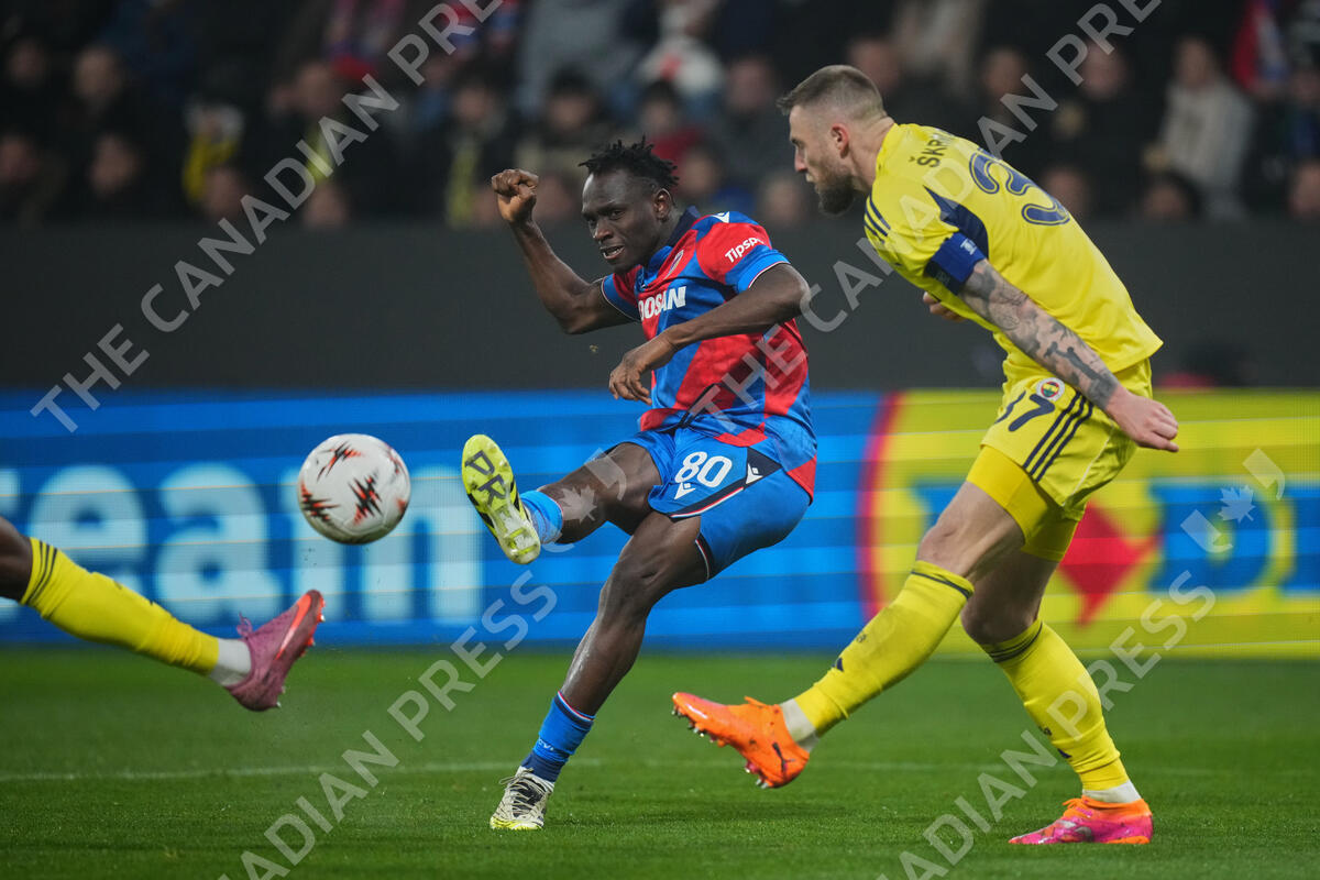 Plzen's Prince Kwabena Adu, left, attempts a shot at goal in front of Fenerbahce's Milan Skriniar during the Europa League opening phase soccer match between Viktoria Plzen and Fenerbahce in Plzen, Czech Republic, Thursday, Nov. 6, 2025. (AP Photo/Petr David Josek)