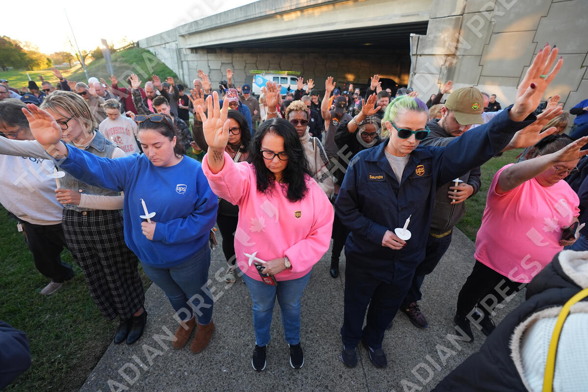 Attendees pray during a vigil Thursday, Nov. 6, 2025, in Louisville, Ky., after a UPS plane crashed at Louisville Muhammad Ali International Airport. (AP Photo/Darron Cummings)
