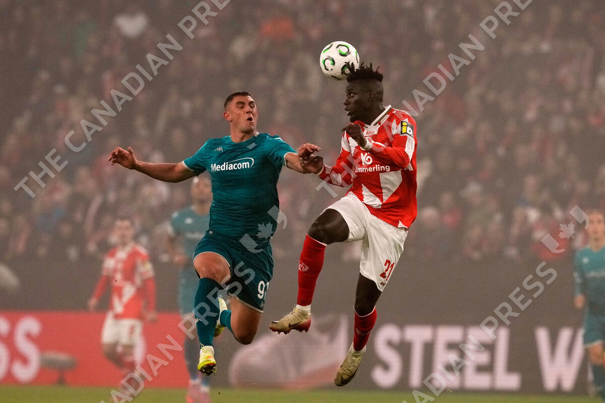 Fiorentina's Roberto Piccoli jumps for the ball against Mainz's Danny da Costa during the Europa Conference League match between Mainz and Fiorentina in Frankfurt, Germany, Thursday, Nov. 6, 2025. (AP Photo/Michael Probst)