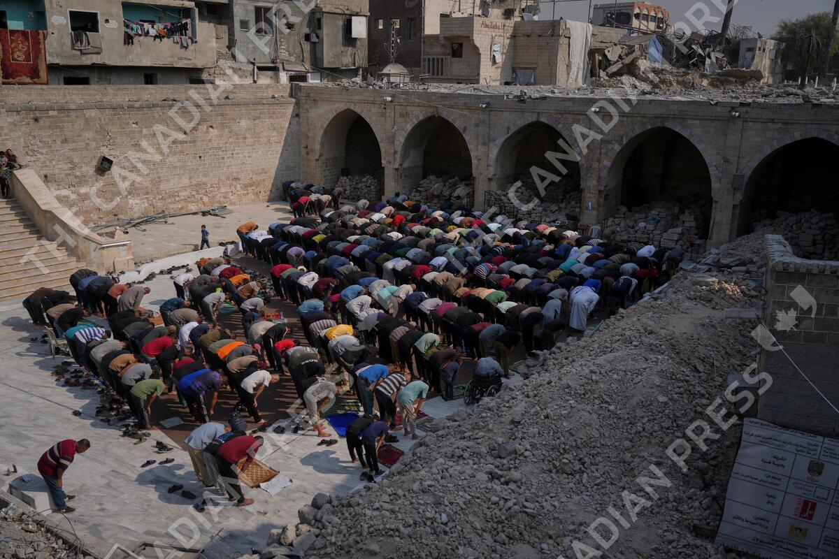 Palestinians attend Friday prayers at the Omari Mosque in Gaza's Old City Friday, Nov. 7, 2025. (AP Photo/Jehad Alshrafi)