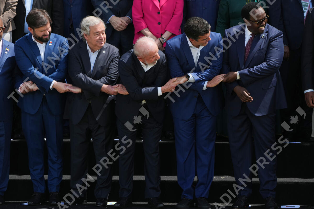 From left, Chile President Gabriel Boric, U.N. Secretary-General Antonio Guterres, Brazil President Luiz Inacio Lula da Silva, Para's Gov. Helder Barbalho and Somalia Deputy Prime Minister Salah Ahmed Jama hold hands during the group photo of the COP30 U.N. Climate Summit in Belem, Brazil, Friday, Nov. 7, 2025. (AP Photo/Fernando Llano)